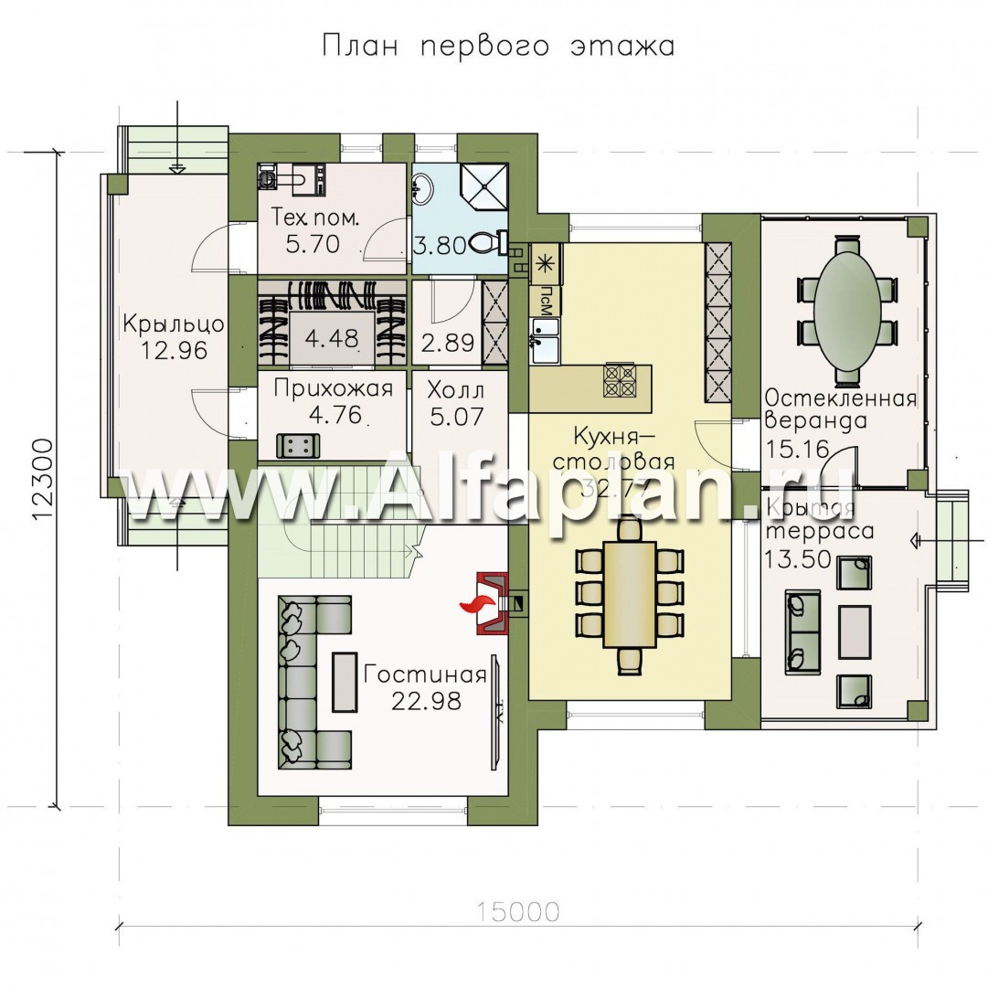 На первом этаже коттеджа находятся общие помещения. Попасть внутрь дома можно через просторное крытое крыльцо, отсюда же ведет отдельная дверь в котельную. Столовая имеет четко выраженную кухонную зону, ее размеры позволят собираться за одним столом большой семье и принимать гостей, не думая об экономии места. Из столовой можно попасть на летнюю террасу с легкой кровлей, а также на веранду, застекленную ударопрочными стеклопакетами и как нельзя лучше подходящую для оборудования дополнительной обеденной зоны. Террасу же можно приспособить под «мягкую» зону отдыха или, при желании, под кальянную. Также на первом этаже размещена гостиная, предполагающая монтаж камина, небольшой санузел и сауна на одного человека.