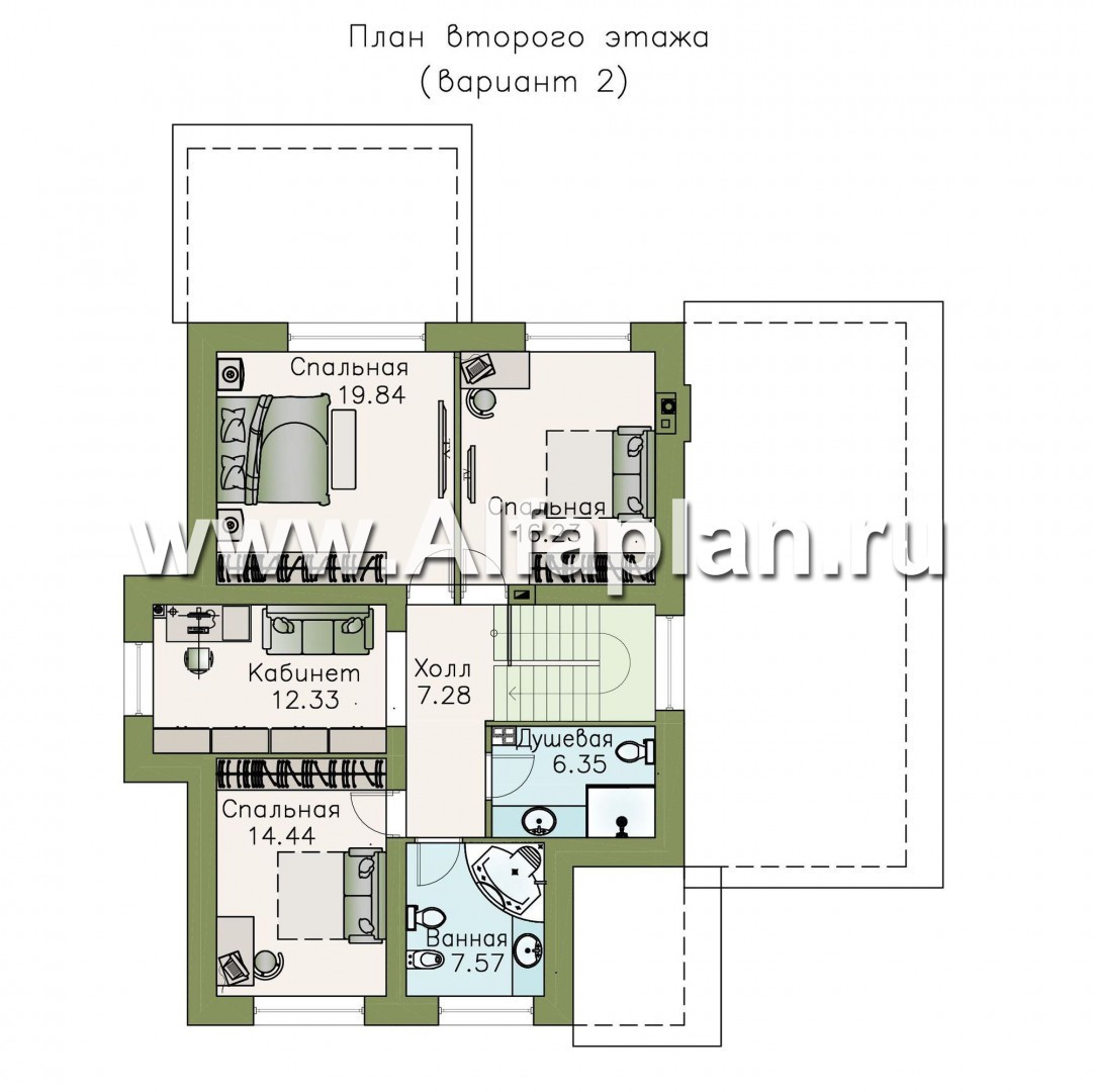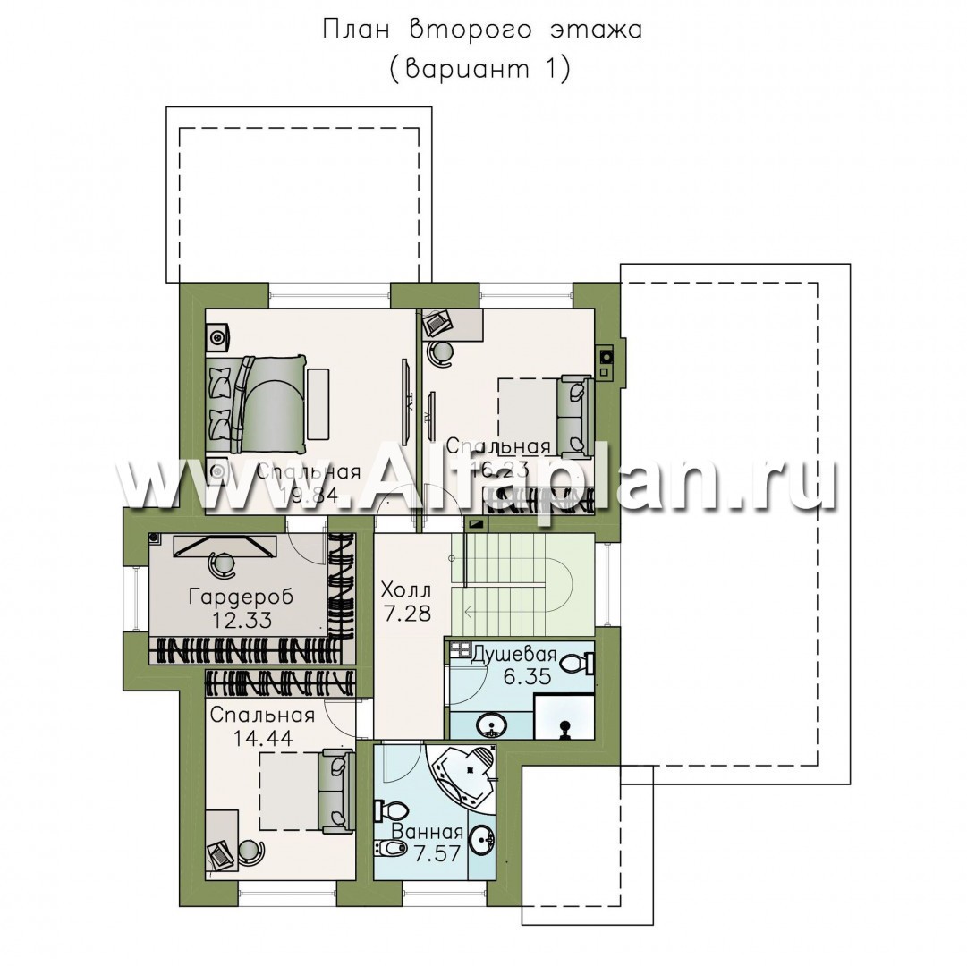 Из холла ведет лестница на второй этаж, который подразумевает наличие четырех жилых комнат и двух санузлов – душевой и ванной. Три просторные, раздельные спальни позволят каждому члену семьи оборудовать себе индивидуальный уголок отдыха и не мешать друг другу. Четвертое помещение можно использовать в трех вариантах. Первый – это гардеробная, которая просто необходима, если в доме проживает более трех человек. Второй вариант – рабочий кабинет, третий - еще одна гостевая комната. При замене вариантов размеры комнат остаются прежними.